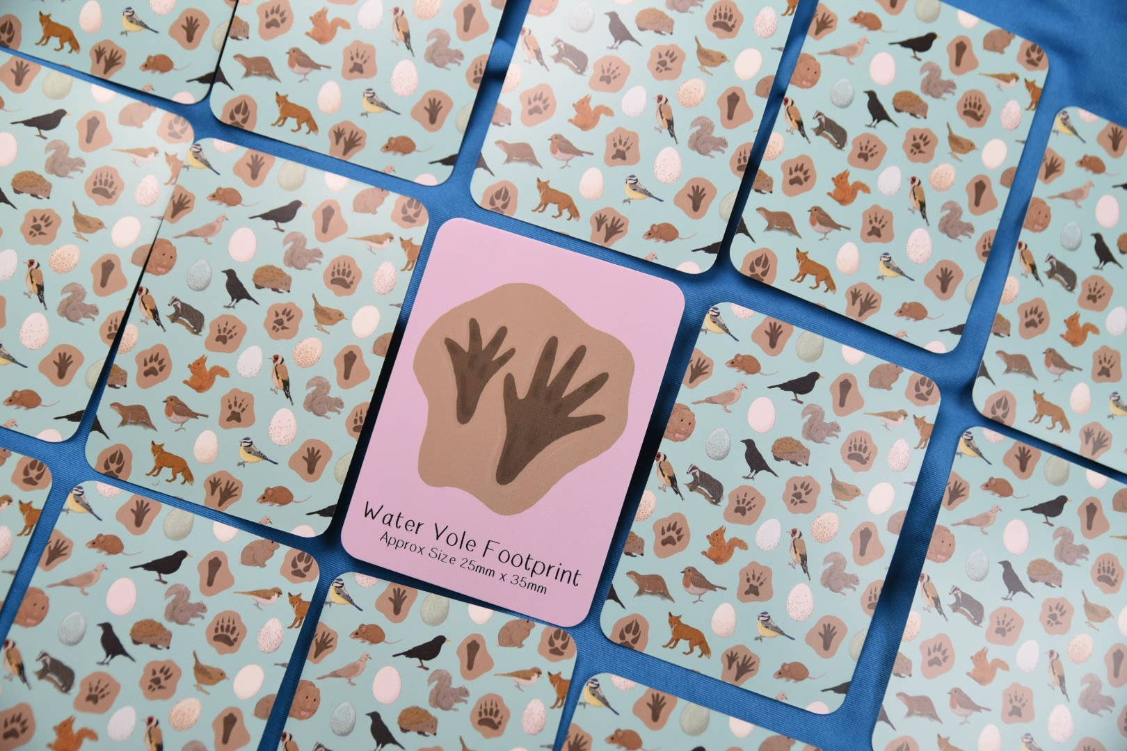 Wood mouse and footprint. Badger and footprint. Red Fox and footprint. Rabbit and footprint. Otter and footprint. Red Deer and footprint. Hedgehog and footprint. Red Squirrel and footprint. Water Vole and footprint. Wren and egg. Carrion Crow and egg. Collared Dove and egg. House Sparrow and egg. Woodpigeon and egg. Robin and egg. Goldfinch and egg. Blue Tit and egg. Blackbird and egg.