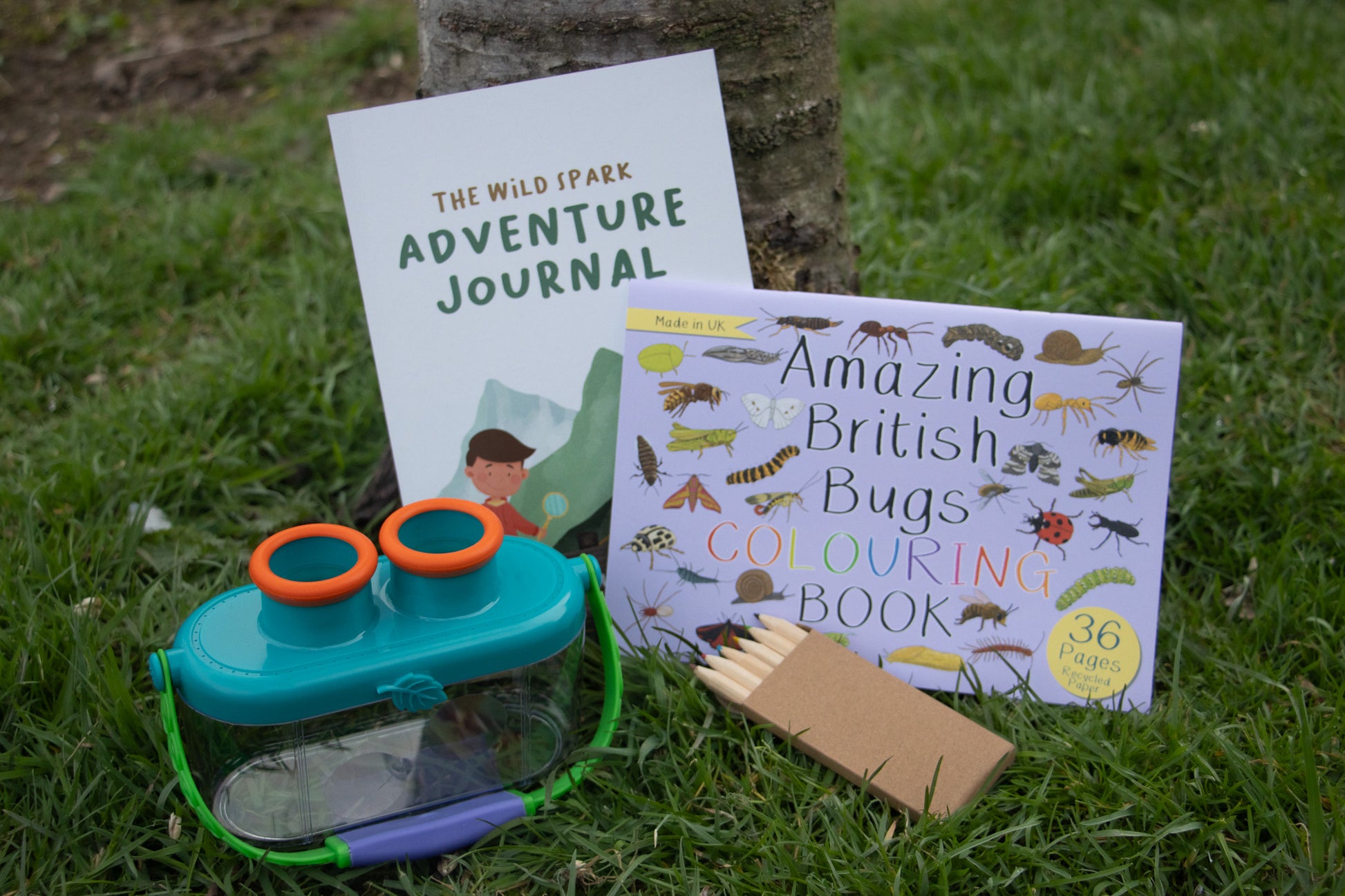A gift set containing The Wild Spark Adventure Journal, Amazing British Bugs Colouring Book and GeoSafari Jr. Bugnoculars.