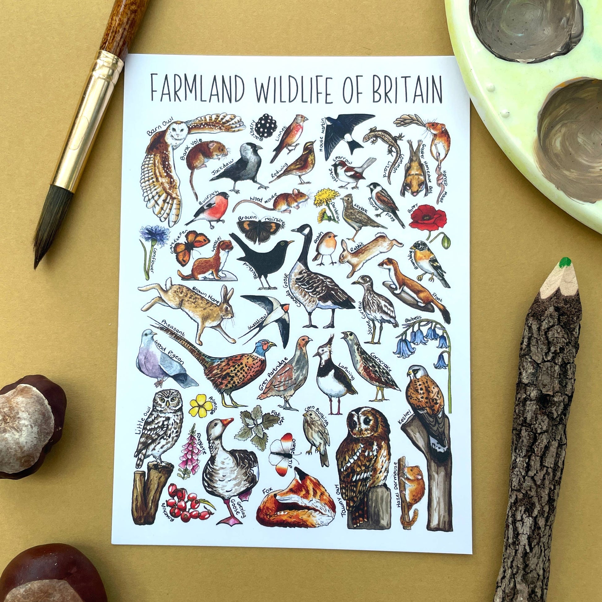 'Farmland Wildlife of Britain' watercolour illustrated postcard.